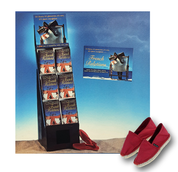 Hodder gave away a pair of espadrilles with every hardback of French Relations sold out of a ‘dump bin’ (the glorious name for the now-outdated promotional cardboard bookshelf displays offered to bookshops for certain titles). The warehouse soon filled up with footwear and, much to their alarm, poor booksellers found themselves asking each customer’s shoe size to go with their summer read. It drove them mad, but it worked; copies of French Relations raced out of shops as fast as those woven soles could carry them.